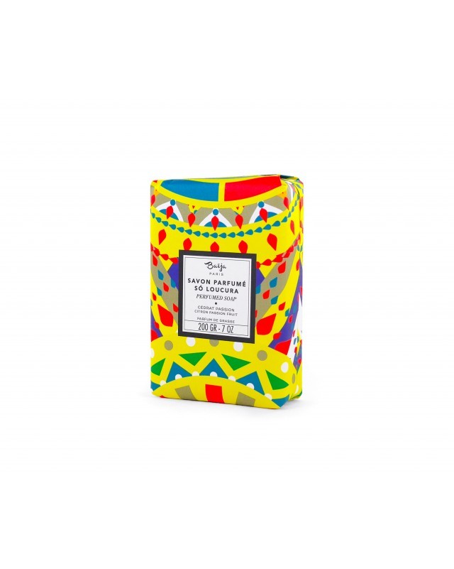 Le savon solide parfumé Só Loucura est élaboré en France à partir de Beurre de Karité et d'Huile végétale certifiée RSPO, sans EDTA ni colorant.